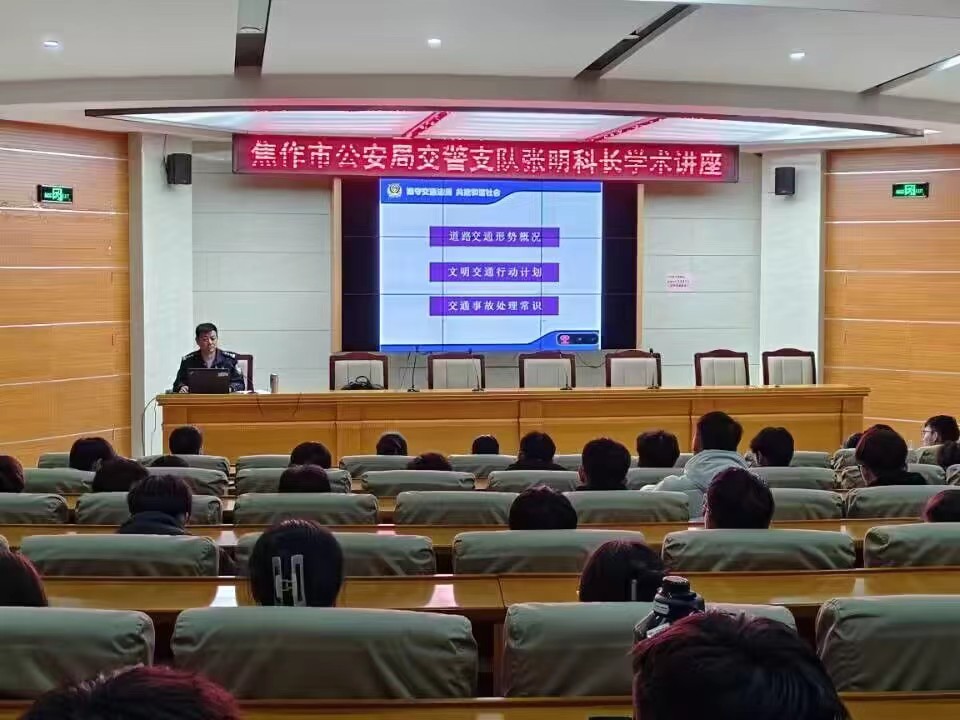 张明就焦作市交通安全基本情况展开讲座,用真实的案例、通俗易懂的语言以案释法、以法论事,告诫同学们务必增强交通安全意识,时刻把交通安全放在心上,学习了解交通安全相关基本知识,做到知法,懂法,守法,做到知晓交通隐患,知晓基本的避险方法,并有意识地规范身边亲朋好友安全出行。在讲座的最后,张明向同学们普及了基本交通标志、交通信号的相关知识,呼吁大家摒弃交通陋习,遵守交通信号、标志,规范出行。在热烈的掌声中,交通安全学术讲座圆满结束。