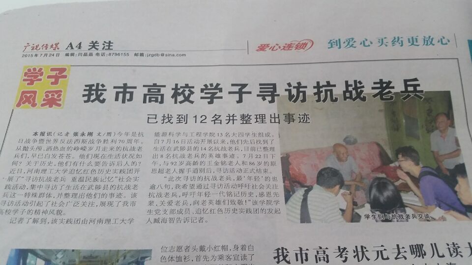 今年是抗日战争暨世界反法西斯战争胜利70周年。从抛头颅、洒热血的峥嵘岁月走来的抗战老兵们,早已白发苍苍。他们现在生活状况如何?关于历史,他们有什么要告诉后人的?近日,河南理工大学追忆红色历史实践团开展了“寻访抗战老兵 重温民族记忆”社会实践活动,集中寻访了生活在武陟县的抗战老兵这一特殊群体,并整理出他们的事迹。该寻访活动引起了社会广泛关注,展现了我市高校学子的精神风貌。