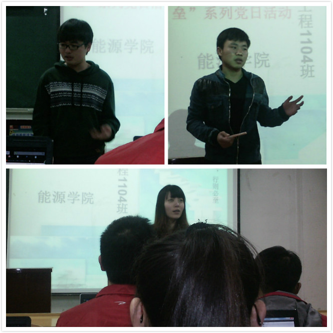为积极响应学校号召,加强支部组织思想建设,进一步提高支部的凝聚力,充分发挥学生党支部的战斗堡垒作用,4月11日下午,能源学院工业工程1104班党支部在院楼102教室开展以“一个支部一个堡垒”为主题系列党日活动。工业工程1104班全体党员、预备党员和积极分子参加本次活动。能源学院11级辅导员封静老师、采矿1004班支部书记朱乾坤、校大通社社长王景和校网络工作室主任贺浩应邀出席本次活动。