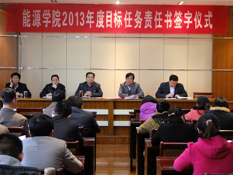 为进一步推进和落实学院2013年各项目标任务,4月9日下午,能源学院在院楼201会议室举行2013年度目标任务责任书签字仪式。学院党委书记魏平儒、院长勾攀峰等领导班子成员和全体教职工参加了本次会议。会议由魏平儒主持。