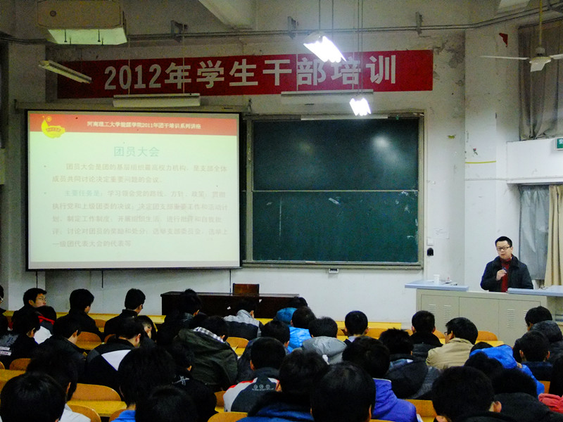 11月28日下午,能源学院2012年学生干部培训第三讲关于团组织与团学活动的讲座在院楼104教室成功举办。此次讲座由机械学院党委副书记支光辉主讲,我院团委副书记郭臻臻和全体学生干部参加了本次讲座。