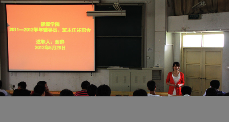 5月29日下午,能源学院在学院办公楼102、103、104教室分别召开该院2011-2012学年辅导员、班主任工作述职会,各年级辅导员、各班班主任及学生出席本次述职会。首先,各年级辅导员分别从思想政治教育、班级文化建设、班级干部培训、学生日常工作、心理健康教育、工作中存在的问题等方面总结了一学年来的工作情况,并结合下一学年的工作计划和同学们进行了沟通和交流。随后各班班主任老师结合该学年的班级工作情况向自己的学生进行了汇报和总结。本次述职会搭建了一个辅导员、班主任展示自我工作的平台,为老师与同学的沟通提供了更好的渠道,为下一步学生对辅导员、班主任工作评价提供了更好的参考依据。