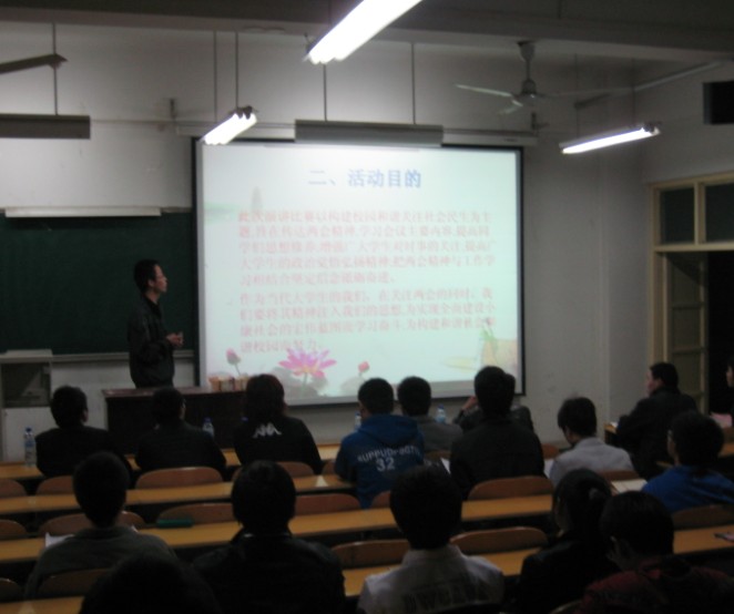 构建和谐校园,关注社会民生,畅谈两会感想。4月5日晚,由能源学院团委主办,能源学院新闻中心承办的演讲比赛在能源学院院楼102教室成功举行。能源学院团委办公室主任张新、院青年年志愿者协会副会长姚常永、院学生会宣传部部长孙亚萍、院新闻中心主任陈帅、副主任魏兵担任了比赛嘉宾评委。我院广大演讲爱好者共计30余人参与了此次比赛。