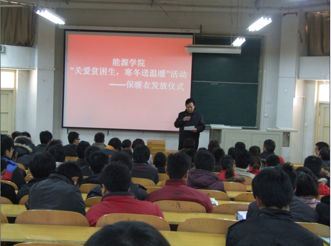 首先,团委书记支光辉宣读了获得资助的学生名单,随后该院辅导员为家庭困难学生发放保暖棉衣,接着获得资助的学生代表采矿08级学生李举东同学代表受资助同学发言:“我们收到的不仅是一件衣服,更是一份爱,这个冬天我们不再寒冷!感谢学院领导的关心帮助,我们要加倍努力学习,以优异的成绩和感恩的心回报社会。”最后能源学院党委副书记浮新平代表能源学院勉励家庭困难学生要自强、自立、自尊、自爱,努力提高自身素质,成为合格建设者和可靠接班,以自己的实际行动回报社会,回报父母!