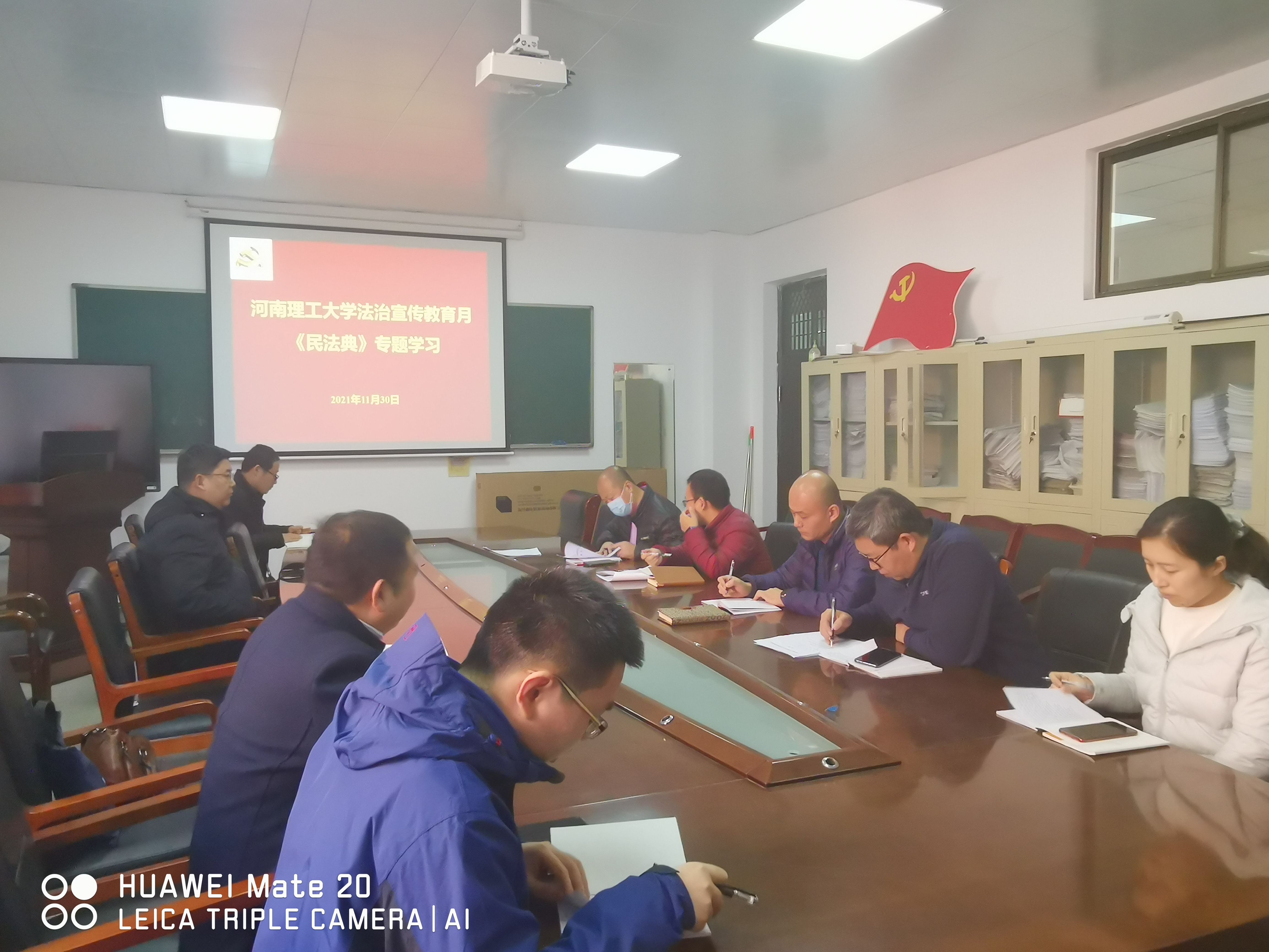 为营造尊法学法用法守法的法治氛围,进一步提高全院师生法治意识和法治素养,11月23日下午,能源学院组织全院教职工以系室为单位集中学习《民法典》。