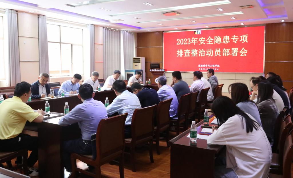 为深入学习贯彻习近平总书记关于安全生产的重要指示精神,全面排查整改学院重大事故隐患,着力从根本上解决师生安全问题,5月23日下午,学院于201会议室召开安全隐患专项排查整治动员部署会。学院党委书记李怀珍,院长郭文兵,副书记邵水军,副院长杨玉中、李东印,各科室科长、实验中心全体老师、辅导员全体老师参加本次会议。会议由邵水军主持。