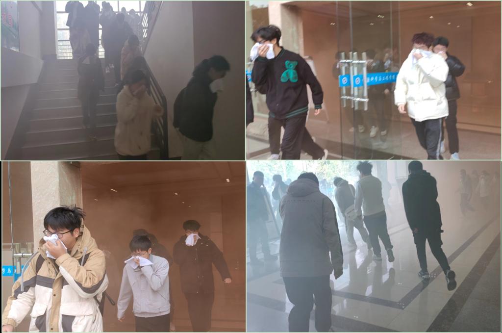 在演练环节,保卫处工作人员对本次疏散演练的流程、疏散路线和注意事项进行了详细讲解,并对安全员进行了专业培训。随着消防警报声响起,烟雾弹放出的浓烈气体弥漫在院楼,师生们按照演练计划,在安全员的引导下,用湿毛巾捂住口鼻,弯腰躬行,沿着疏散路线,从院楼二楼迅速、有条不紊地撤离到楼外安全地带。身临其境地感受“火灾场景”逃生,让参与师生体验深刻,真正掌握了火灾逃生的相关技能。