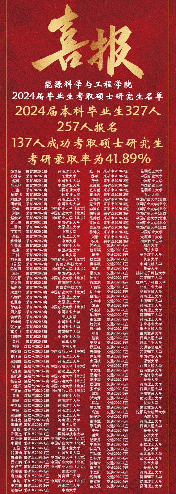 据统计,学院2024届本科毕业生327人,其中136人考取研究生,考研录取率达41.89%。考研学子超过半数被同济大学、中南大学、重庆大学、东北大学、南京理工大学、西南交通大学、武汉理工大学、长安大学、中国矿业大学、中国矿业大学(北京)、中国石油大学(北京)、中国石油大学(华东)等985、211高校录取。部分班级考研成绩突出,其中采矿卓2002班考研录取率高达60.71%,,煤层气2002班考研录取率高达57.14%,采矿2002班考研录取率高达56.66%。