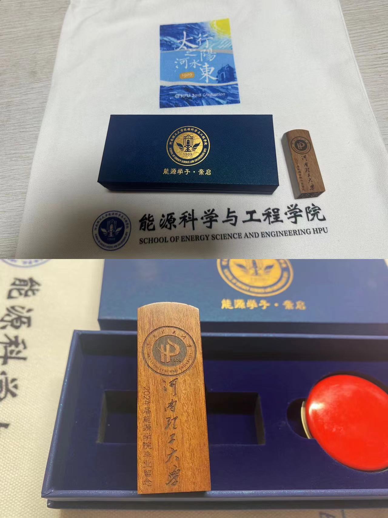 一枚印章,承载希翼。印章盒主体采用能源蓝色调,烫金的学院院徽与“能源学子·亲启”六个大字交相辉映,温柔地传递着对学子们的深深祝福与期许。古色古香的木雕印章,刻落每一位2024届毕业学子的名字,独一无二。印章正面,“河南理工大学”和“2024届能源学院毕业生留念”的字样,如同历史的印记,镌刻在学子们的心头,提醒他们不忘初心,砥砺前行。背面“能为祖国,源起路矿”的誓言,更是铭刻在每位学子的心田,昭示着他们肩负的重任与使命。一个帆布包,蕴含祝福。简约的白色帆布包载满四年的青春记忆,“能为祖国,源起路况”的大字印在包上也印在每一位能源学子心里。希望每位同学无论走到哪里,都不会忘记“太行之阳河水东”母校的谆谆教诲,继续传承和发扬学院乌金品质的优良传统,一“帆”风顺,昂首阔“步”,坚定向前。