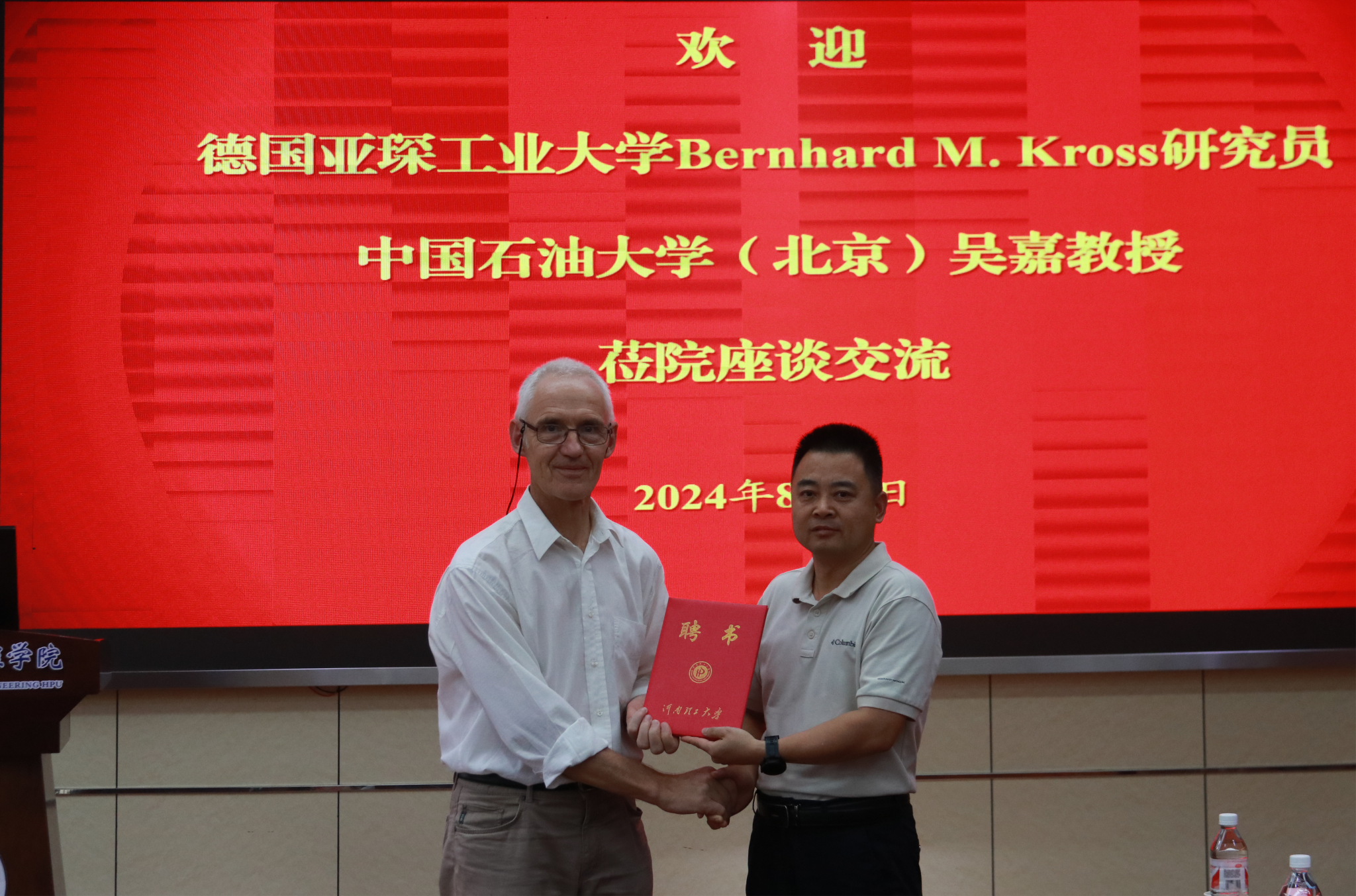 Krooss教授总结了他在常规能源(煤和石油)和非常规能源(煤层气、页岩气、天然氢)领域43年的研究经历,讲述了自己的研究团队如何通过国际化合作率先攻克高压气体吸附、多组分气体竞争吸附实验装置及相应的高精度测试技术。他指出,在全球能源转型和“双碳”背景下,研究团队只有在相关领域持续做出创新性、前瞻性、引领性的科研成果才能在国际上占据一席之地。在场师生踊跃提问,Krooss教授都一一作了详细解答。中国石油大学(北京)吴嘉副教授陪同Bernhard M. Krooss教授来访,并作了题为“沉积有机体系的氢逸度表征及对地质氢化学能本质的思考”的学术报告。