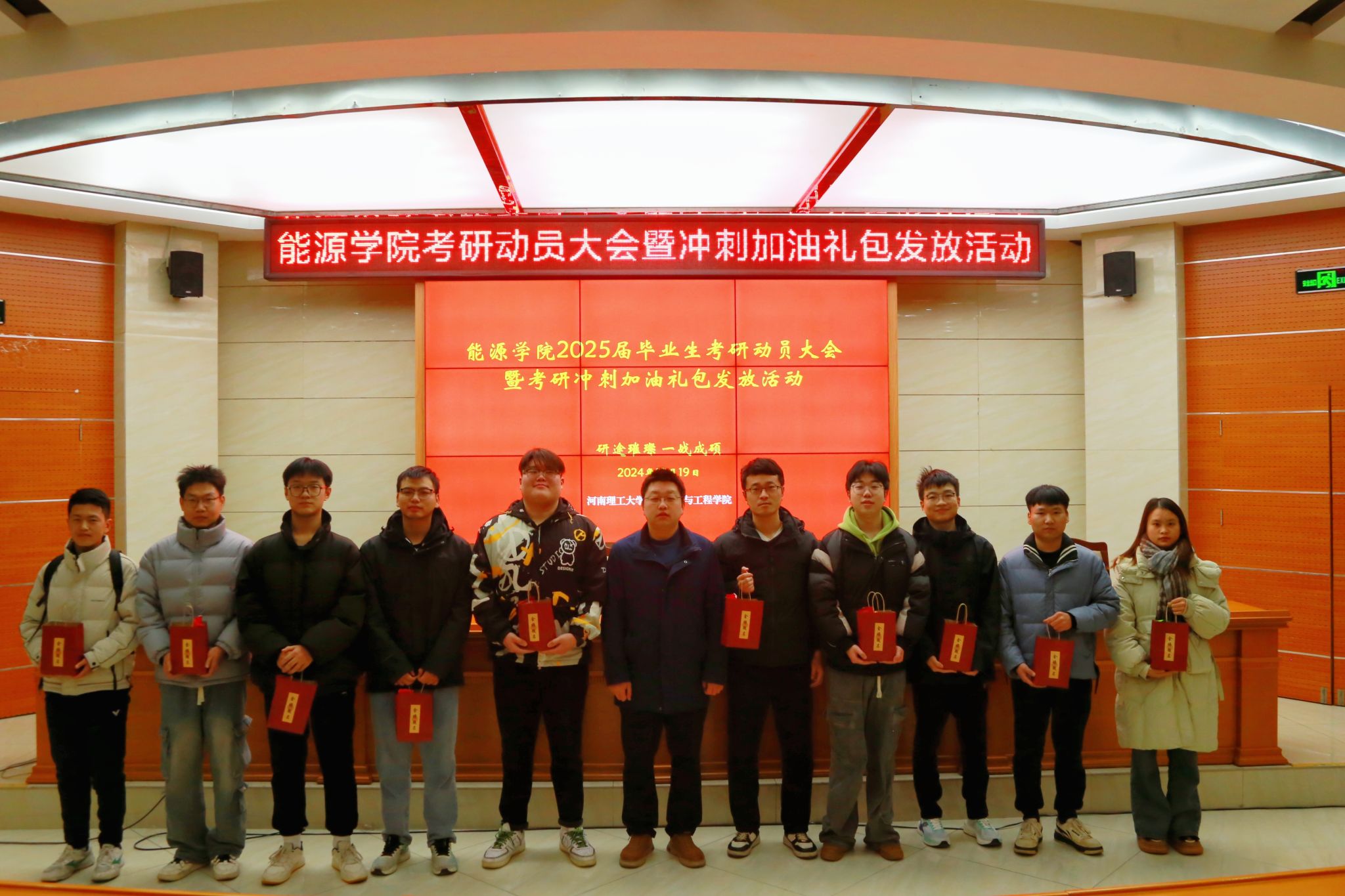 2025年全国硕士研究生招生考试在即,为帮助考研学子掌握考场规则和注意事项,鼓舞备考士气,坚定必胜信心,12月19日晚,学院在104学术会议厅举办“研途璀璨 一战成硕”考研动员大会暨冲刺加油礼包发放活动。学院2025年全国硕士研究生考试报考学生参加活动,大会由2021级辅导员岳帅帅主持。