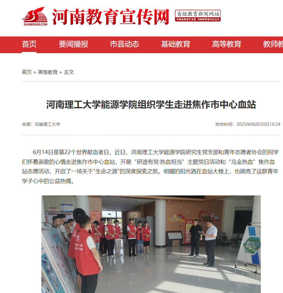 河南教育新闻网和6月19日的《焦作日报》A08版“高校在线”报道能源学院研究生党支部学生和青年志愿者协会成员走进市中心血站,开展“研途有党·热血担当”主题党日活动和“乌金热血”志愿活动。全文如下。