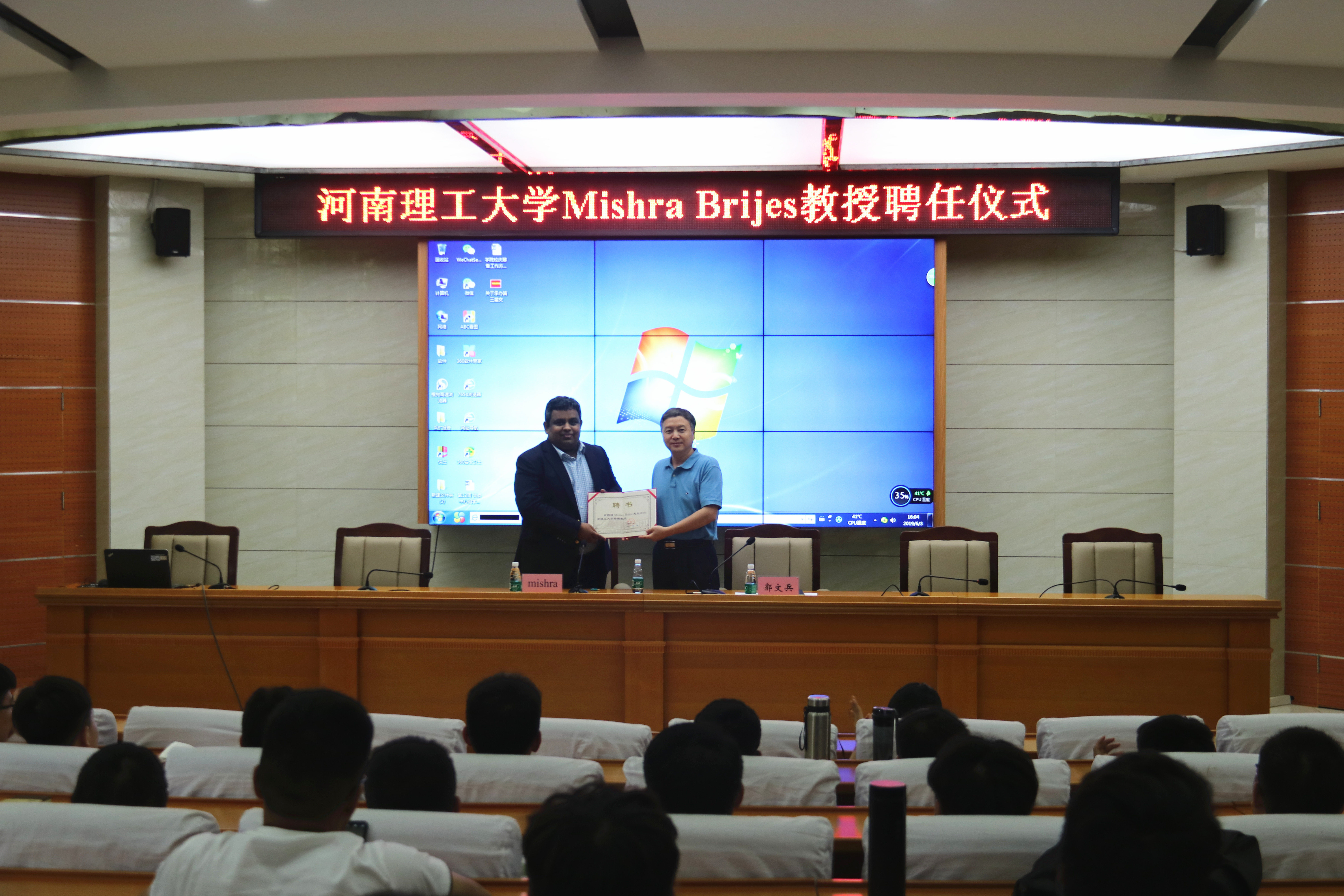 6月4日,能源学院在104学术报告厅举行美国西弗吉尼亚大学Mishra Brijes特聘教授聘任仪式。院长郭文兵教授主持并为Mishra教授颁发了聘任证书。