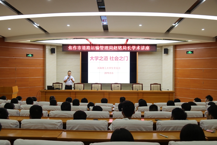 9月5日晚,应能源学院的邀请,焦作市道路运输管理局副局长赵铭于院楼104学术报告厅作了题为“大学之道,社会之门”的学术讲座。学院交通工程系主任郭保华和该专业百余人共同聆听了讲座。讲座由郭保华主持。