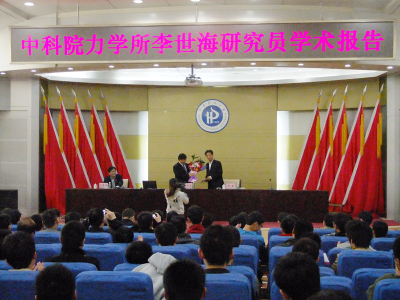 随后,李世海研究员在报告中总结了其近14年的研究成果,并从理论模型的建立、基于GPU技术的CDEM商业化软件开发(GDEM)及其在边坡、地下洞室等工程中的应用等三方面向在场师生介绍了基于连续介质力学模型的离散元方法(CDEM),他还讲述了应变强度分布准则及其工程应用,并着重介绍了应变强度分布准则的概念,和该准则在单元计算以及在滑坡稳定性评价中的应用。本次报告会不仅增长了同学们的见识,开阔了同学们的视野,而且还给在场的老师们在教学研究中带来了新的灵感。
